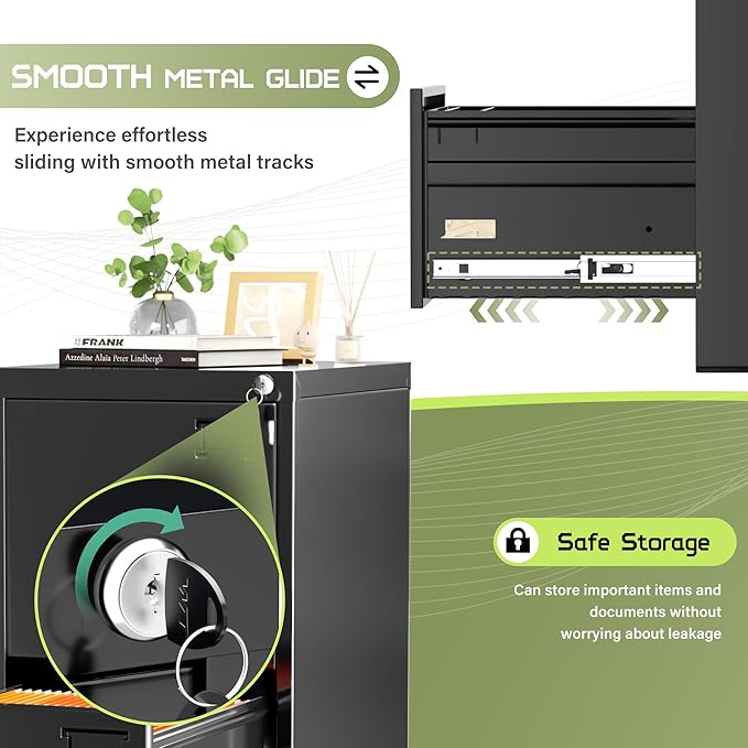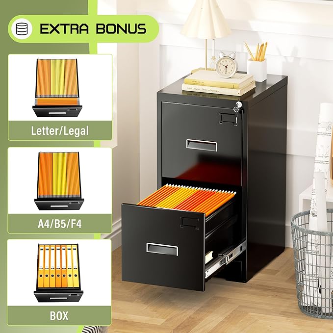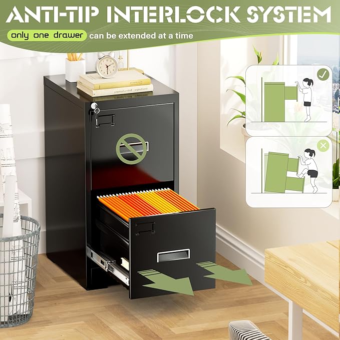 - 【High security】Two-drawer file cabinet with Lock is equipped with a built-in interlocking system to ensure drawer security. One locks with two keys ensures that your files are safe and easy to manage. The cabinet with drawers can be locked into two drawers at the same time with a lock, which is smooth and easy to operate.