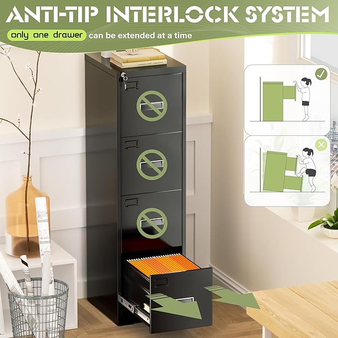 - 【High security】Four-drawer file cabinet with Lock is equipped with a built-in interlocking system to ensure drawer security. One locks with two keys ensures that your files are safe and easy to manage. The cabinet with drawers can be locked into four drawers at the same time with a lock, which is smooth and easy to operate.