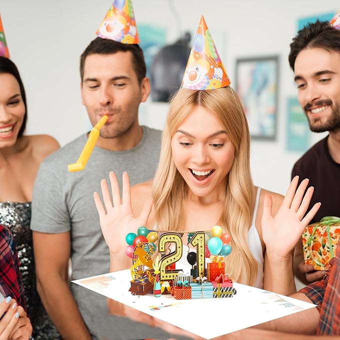 • 21st Birthday Pop Up Card: This cute 21th birthday pop up card is mini-masterpiece displays a beautiful 3D pop-up design.It can be popped up of features “21” with balloons and gift box. Ideal Creative Gifts for party. Makes your birthday or anniversary party’s decorations stand out