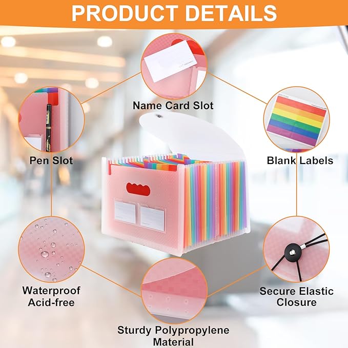 • Design Details: Two business card pockets are designed to easily store many small cards, such as courses, schedules, business cards. Accordion file Organizer comes with small colored labels to help you sort your files. The rope of the bayonet is of two sections and is used according to the thickness of the file