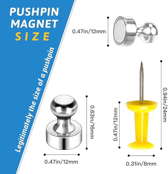 - 【Premium Material】Strong fridge magnet will never let you down! magnets are made of neodymium material, 3-layer (Nickel + Copper + Nickel) Triple-coated, with a smooth edge. These push pin magnets are tiny too, the size of each magnet is 0.47in/12mm x 0.62in/16mm, so they won't cover up the exact things you want to display. They are strong and are suitable for any magnetic surface but are not suitable for glass magnetic boards, note that stainless steel is NOT magnetic.