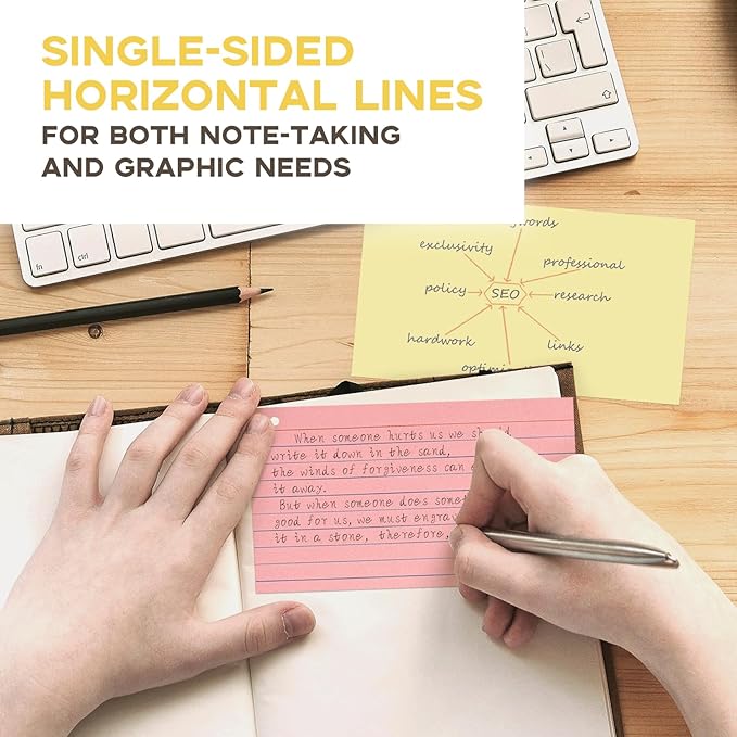 • Brief Design: The front of the colored index cards 3x5 is horizontally lined and the back is blank; The red title line and proper space between lines make neat writing styles, while the other side can be filled with diagrams, drawings, and drafts