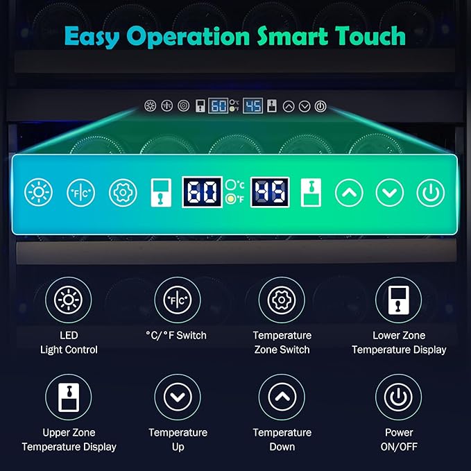- DUAL-ZONE INDEPENDENT CONTROL & MEMORY FUNCTION - This freestanding wine refrigerator features an independent dual-zone cooling system to store different wines at their ideal temperatures. The upper zone (40-55°F / 5-13°C) is perfect for white and sparkling wines, while the lower zone (55-65°F / 13-18°C) is ideal for reds. The intuitive touchscreen panel allows easy adjustments, and the memory function restores your preferred settings after a power outage. Powered by a high-efficiency compressor, it ensures stable cooling, low noise, and a frost-free environment, preserving your wine’s quality with precision