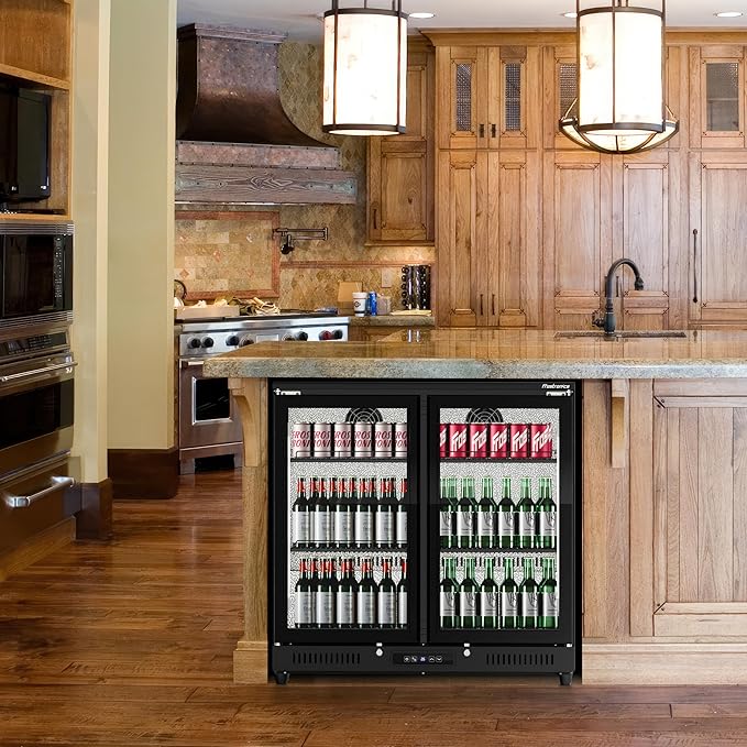 - 〔Dual Lights, Refreshing Sights〕Equipped with two vibrant LED light strips at the front, your Frostronics double hinged door backbar cooler accentuates every beverage within. Ideal for entertaining guests or relaxing solo, the contemporary illumination showcases each can and bottle, transforming your drink assortment into a centerpiece.