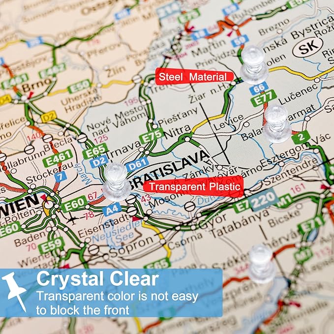 • VERSATILE APPLICATIONS: These clear push pins can be used to pin important documents, papers, photos, etc on bulletin boards, cork boards, wall, posters, memos, calendars. Or to hang small ornaments, mark maps, create beautiful DIY handmade crafts.