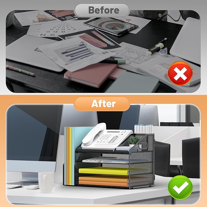 - 4 Tier Organization with Pen Holder: This desk organizer boasts a 4 tier design for efficient sorting of your papers, letters, and other office supplies, along with a dedicated pen holder. It's perfect for maintaining a tidy and uncluttered workspace. The desk file organizer is an essential desk accessory that contributes to an orderly and professional atmosphere