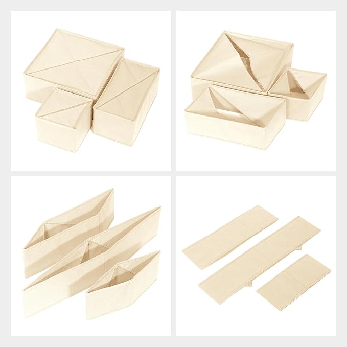 • 【QUALITY MATERIAL】This fabric dresser drawer divider organizer is made with non-woven fabric,which is soft,breathable,easy clean,durable and not easy to bend,deform and tear.These foldable clothes organizer are stackable to take advantage of the space.
