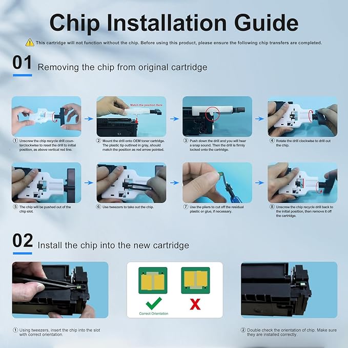 • NO Chip: These compatible hp 218a toner cartridges do not have chip. Please transfer chip from original 218A/218X toner. Follow user instructions and use provided tools to install it. Detailed Instructions Please Check this Product Page for Pictures & Videos