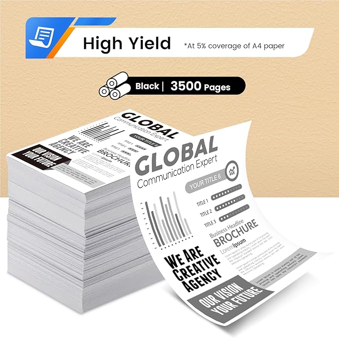 • Page Yield: Up to 3500 pages per black toner cartridge at 5% coverage.