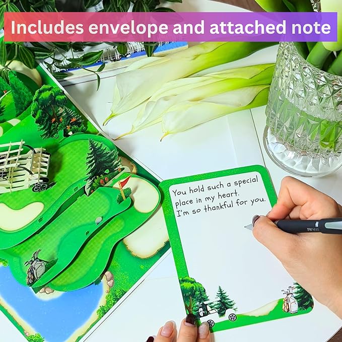 • ENVELOPE AND NOTES INCLUDED: The Golf pop up card is 6 x 8 inches and comes with a white envelope for easy mailing. In addition, the card also has a note card designed to slide out for easy message writing.