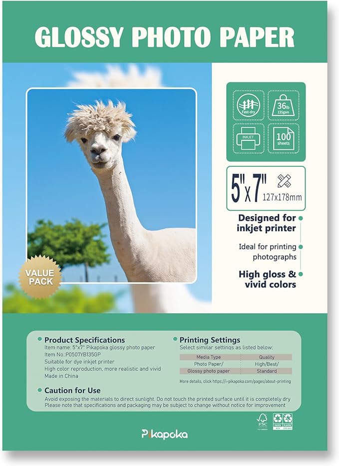 • Pikapoka Thin Glossy Photo Paper: 5R size (5 x 7 inches), 100 value pack, 36lb/135gsm.