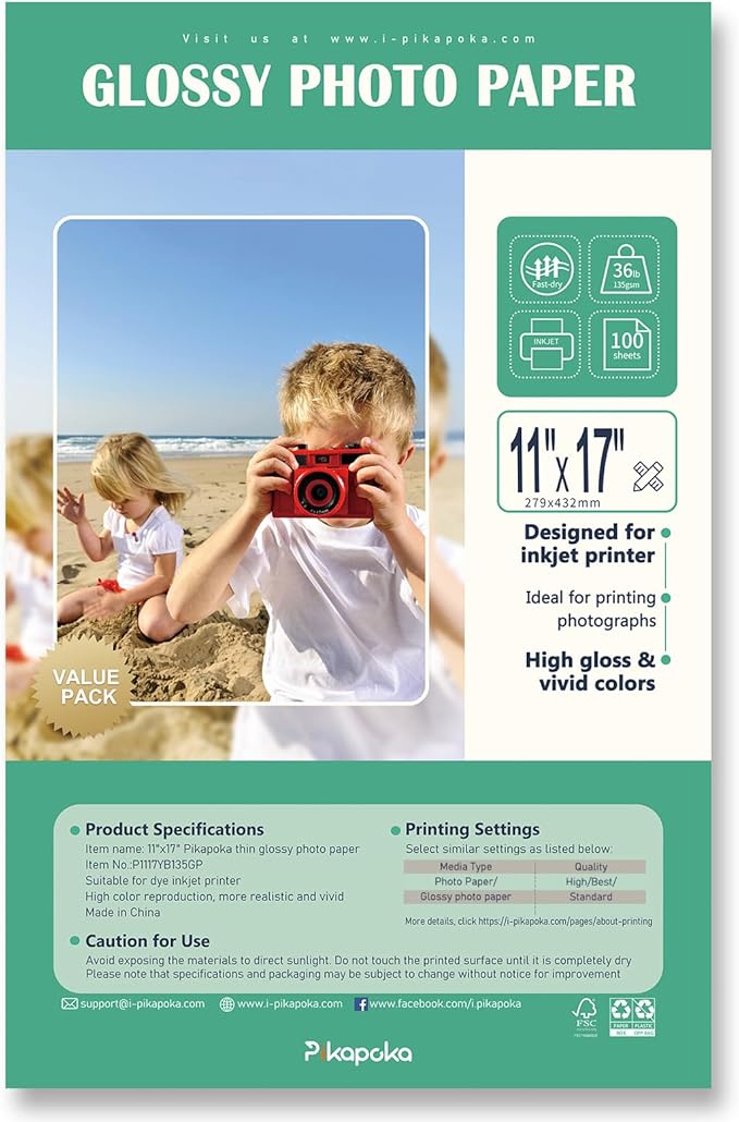 • Pikapoka thin glossy photo paper 36lb(135gsm), size: 11x17 in, 100 Pack
