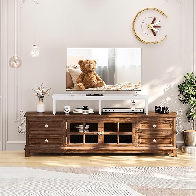 - 【Space Saving】- Raising the TV, the open storage space underneath the TV can be a good place for speakers, controllers, cable boxes, satellite receivers, and game consoles such as PS5, Xbox, and so on. The open space of the tv riser makes it easier to access cables and you don't have to worry about electronic devices overheating.