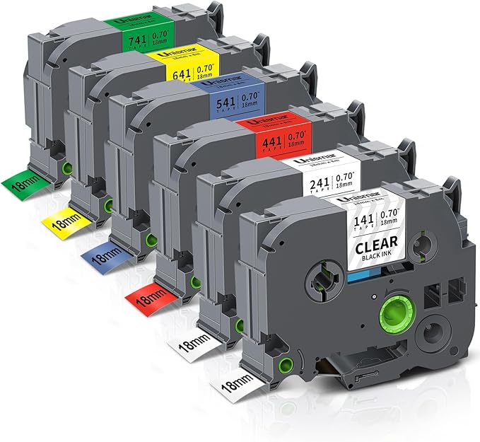 • Color: 1 x TZe-141 (Black on Clear), 1 x TZe-241 (Black on White), 1 x 441 (Black on Red), 1 x 541 (Black on Blue), 1 x 641 (Black on Yellow), 1 x 741 (Black on Green), total 6 packs