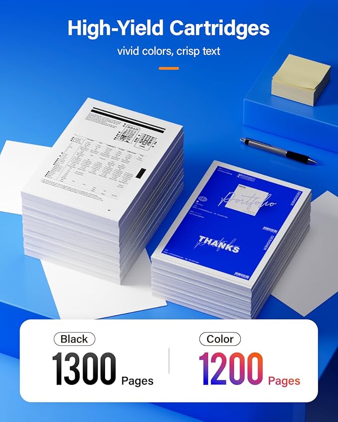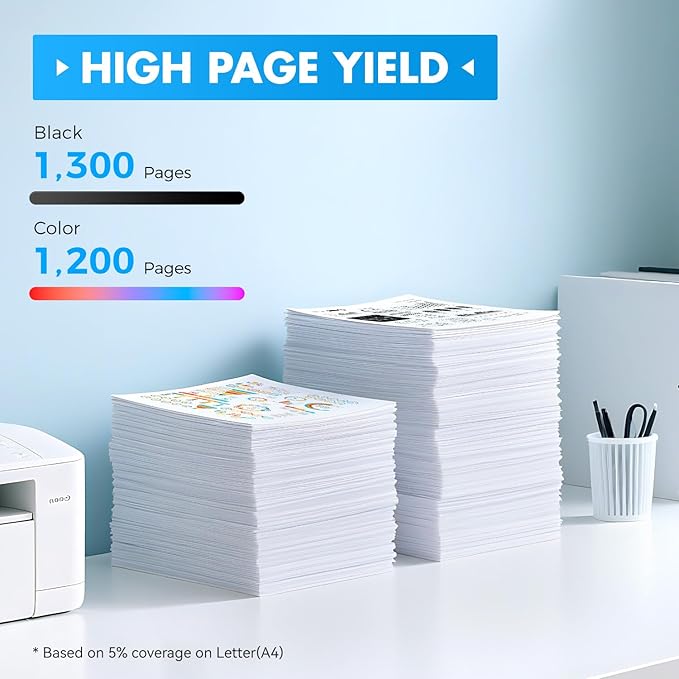 - 【Page Yield】Up to Black is 1,300 pages per black cartridge and Color is 1,200 Pages per color cartridge (Letter/A4, at 5% Coverage).