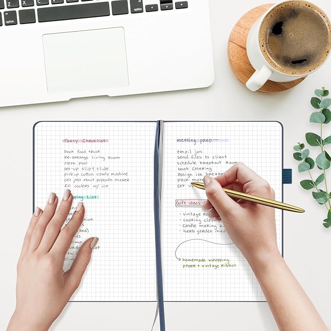 • DURABLE HARDCOVER: A durable vegan leather hardcover protects this notebook from wear and tear while providing a comfortable writing surface. An expandable back pocket holds notes, business cards, and small papers, and includes free sticker labels