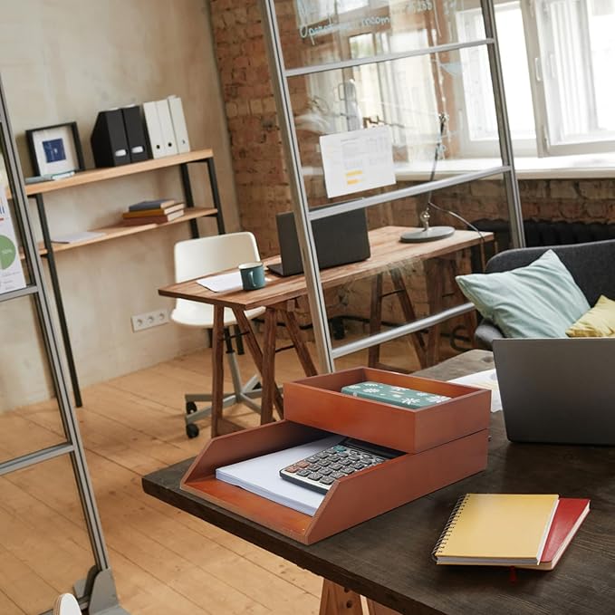 Desk Organizer Letter Tray Set of 2, Magnetic Wooden Tabletop Desktop for Storage Paper Letter Folders Notebooks Copy Print, Workspace Holder, Office Supplies, Keep Stationery Saver-Brown