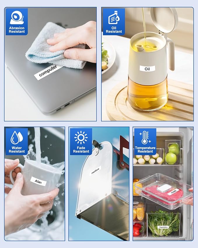 - Features: Our laminated 12mm 0.47" White label maker tape split design makes the label tape easy to peel and apply, with strong adhesion/waterproof/temperature/oil/abrasion/fading, and reliably sticking to various surfaces