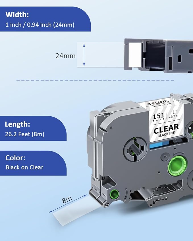 • Package Included: 4 Pack replacements compatible for Brother Ptouch label maker tapes TZe151 (TZ-151 TZ151). Dimensions: Each pack measures 1" (0.94") in width and 26.2 ft (8m) in length, totaling 48 meters across all packs. Color: Black on Clear
