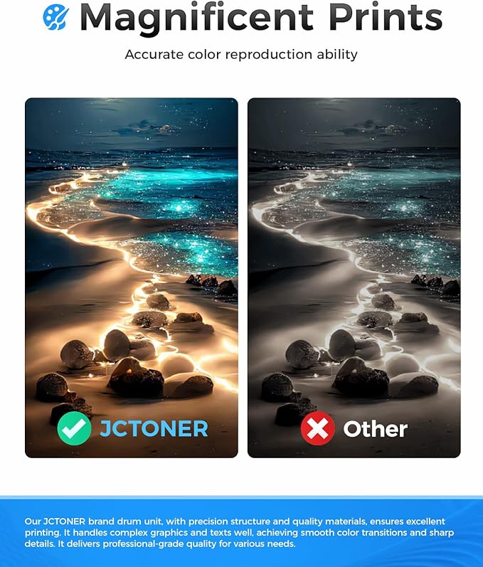 • The latest chip version: The JCTONER toner cartridges are equipped with the latest version of built-in chips, ensuring perfect compatibility between each toner cartridge and the printer. This enables you to print efficiently while maintaining stability and reliability, making installation convenient without the need for manual adjustments. All JCTONER toner cartridges have undergone strict quality testing and have obtained ISO9001 certification. High-quality toner cartridges can meet the demand for high printing volume. The fine toner ensures clear and stain-free printing results and extends the lifespan of the printer. You can purchase with confidence.