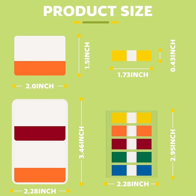 • Package includes: 600 pieces 22 sets in total, 400 pieces 2'' sticky tabs in 20 sets with 10 different neon colors, 200 pieces 0.5inch tabs in 2sets, 20 pieces each color and color as picture displayed.