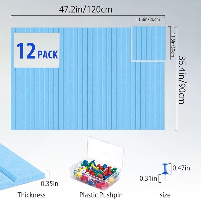 • Enhanced Package:12 pieces of 11.8"x11.8" Large Cork Board for Walls,A box of push pins, pinseasy to customize to any size you need. Very suitable for creating unique layouts that traditional hardwood boards cannot match.