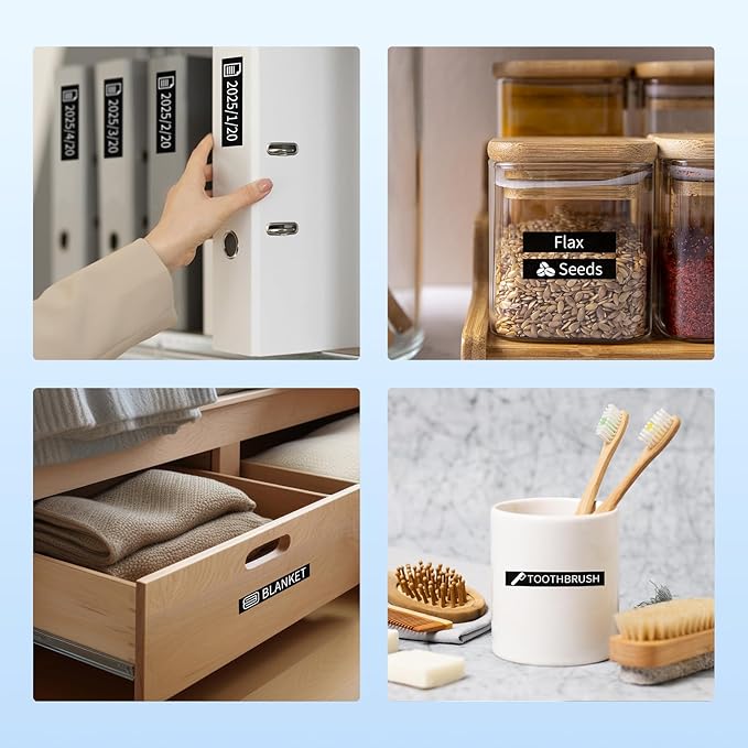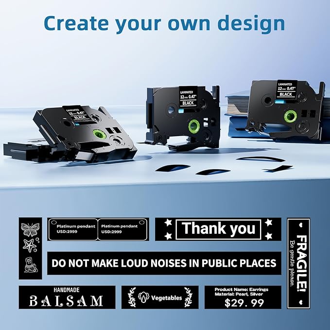 - Versatile Use: These Airmall label maker black tape Compatible with Brother PTouch labelers. Perfect for labeling in offices, retail stores, warehouses, industrial sites, and homes. Great for organizing kitchen jars, shelves, cabinets, files, folders, tools, and small items.