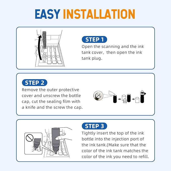 • 【High Page Yield】2 bottles of 140ml black ink can print up to 17000 pages, each color bottle can print up to 6000 pages in 70ml (5% coverage)