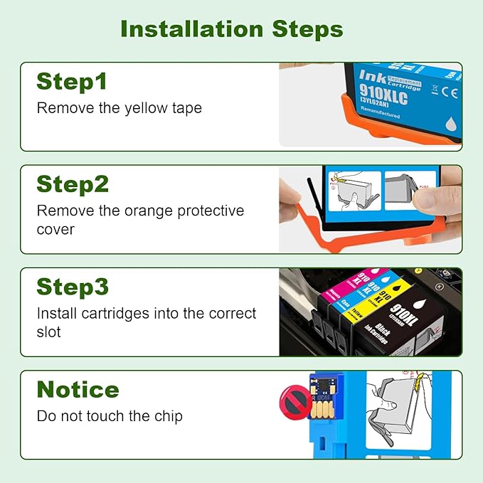 - Package Includes: 1 × 910XL Black Ink Cartridge, 1 × 910XL Cyan Ink Cartridge, 1 × 910XL Magenta Ink Cartridge, 1 × 910XL Yellow Ink Cartridge, and 1 × Upgrade Device (Note: Non OEM ink cartridges )