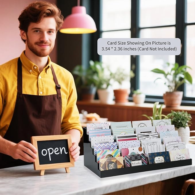 - STURDY CARD STAND - This acrylic black desktop business card holder is built to last. 7 tiers 28 pockets, it can sit securely on any counter or desktop. This make it perfect for a variety of settings, including small businesses, individual departments, reception desks, and trade shows.