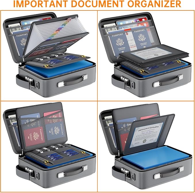 - Fireproof Box with Lock: Protect your valuables with the built-in high-quality combination lock (No keys required). Design with a strong handle&a detachable shoulder strap for carrying everything you needed easily. The fireproof box is suitable for business, travel, office, school, home storage, of course, giving it as a gift to your family is also a good choice. Fireproof box is both fireproof and water-resistant, ensuring your documents stay protected during fires, floods, or wet weather