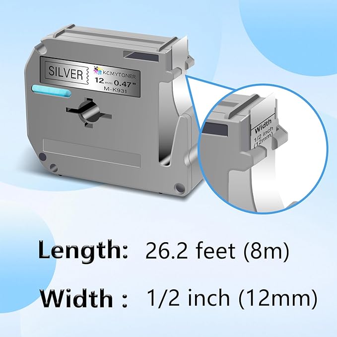 • Package Include: 3 pack KCMYTONER compatible for ptouch M-K931 M931 MK931 M-931 M-K931S non-laminated label maker tape; color: black print on sliver tape; size: 12mm (1/2 inch) x 8m (26.2 feet).