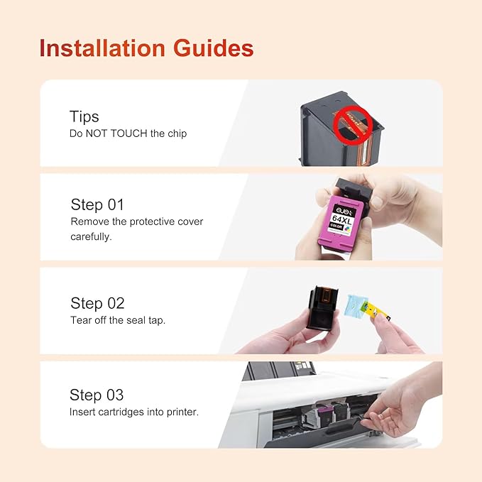 • Upgraded with Latest Chips: ejet for hp ink 64xl black and color combo pack xl is equipped with upgraded smart chip to ensure each ink cartridge will be 100% recognized by listed printers smoothly and displayed by the printer listed for accurate ink level, and ink level monitoring is always easily visualized.