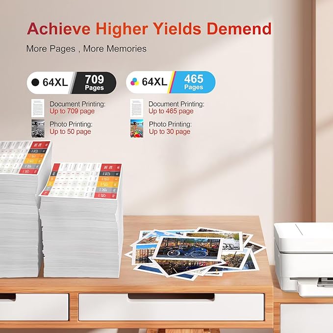 • Cartridge Page Yield for HP 64xl ink cartridge combo pack: Up to 709 pages per 64xl black ink cartridge, 465 pages per 64xl color ink cartridges (at 5% coverage).