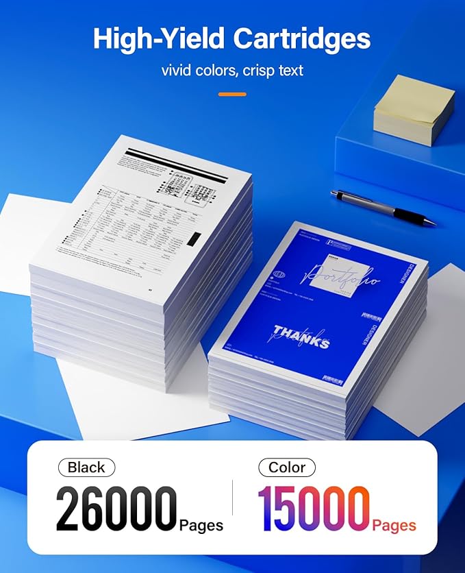 • High Page Yield: 26,000 pages for Black and 15,000 pages for Color toner cartridge (Letter/A4, at 5% coverage)