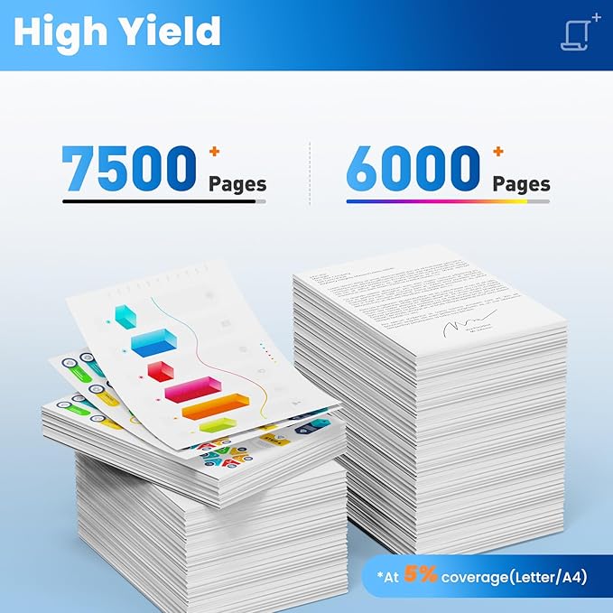- Extra Capacity, High-Yield Printing: Up to 7500 Pages per 414X black toner cartridge, 6000 Pages per 414X Cyan toner cartridge, 414X Magenta toner cartridge, 414X yellow toner cartridge (5% coverage at A4 paper/letter).