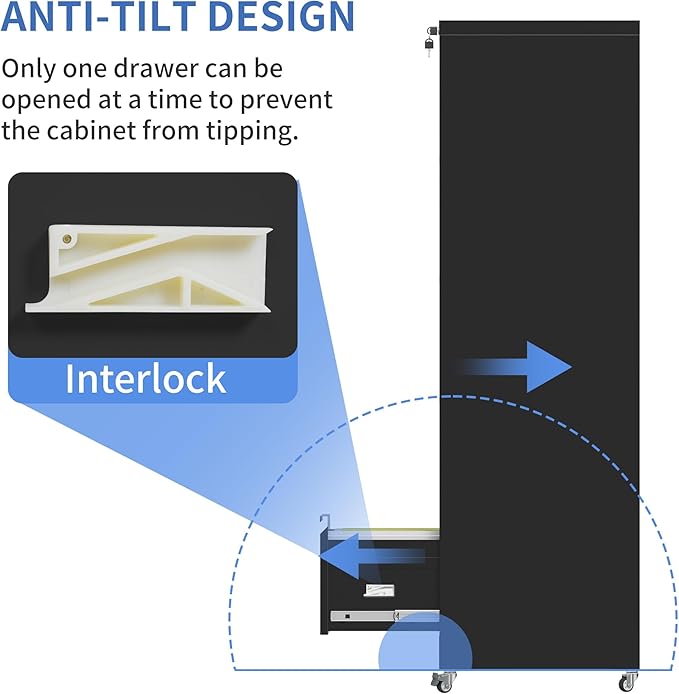 - 【Rolling Fill Cabinet】This 5 drawer under desk file cabinet equipped with 2 lockable casters, 2 x 360° swivel casters and1x anti-tilt wheel. The anti-tilt caster to prevent tipping over. You can easily move the cabinet with wheels, making it easy for you to move to another place.