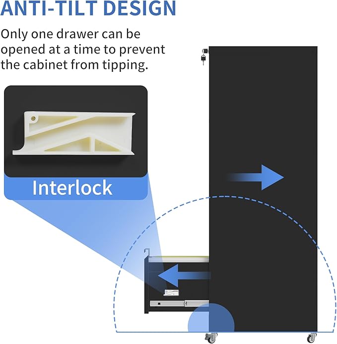 • 【Rolling Fill Cabinet】This 4 drawer file cabinet equipped with 2 lockable casters, 2 x 360° swivel casters and1x anti-tilt wheel. The anti-tilt caster to prevent tipping over. You can easily move the cabinet with wheels, making it easy for you to move to another place.