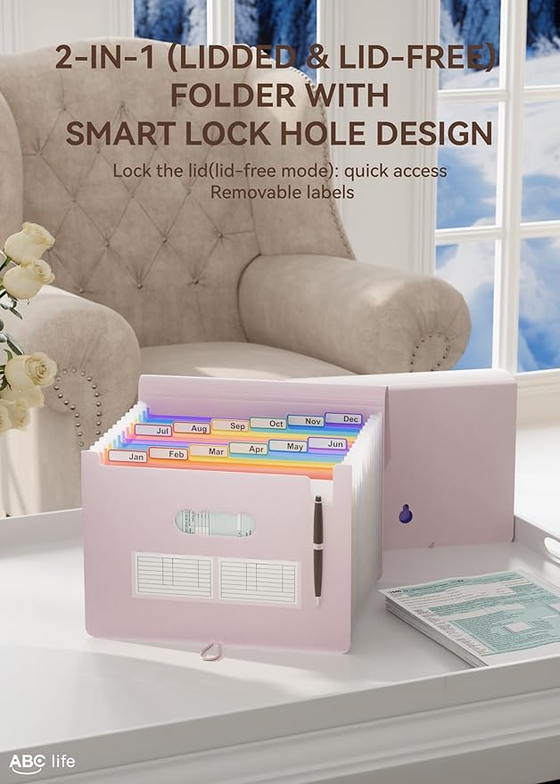 • 【EASY CATEGORIZE】Unique Jan-Dec large tabs and color inner pages design help you to classify your files effectively. Perfect for organizing by month.Upgraded small hole design-the small hole on the back can lock the lid, converting it into a lid-free mode. Frequently used files can be accessed instantly—no more repeated opening and closing.