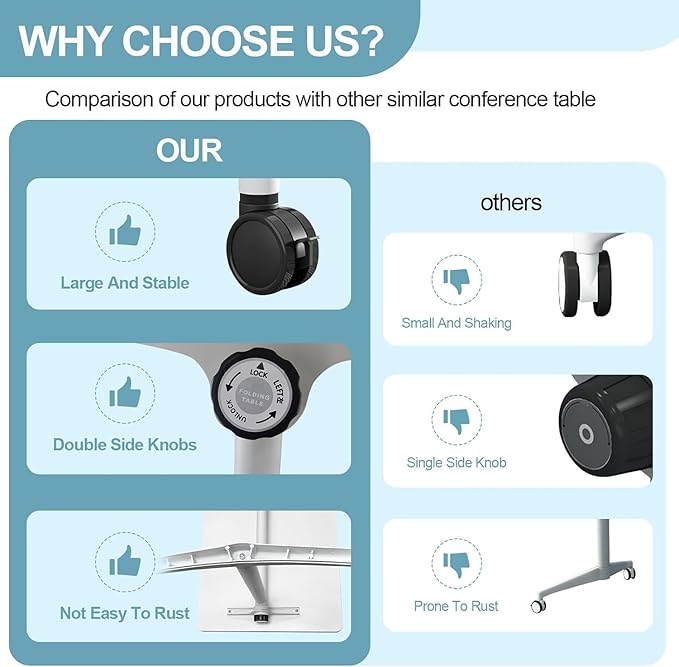 - ✅【360° MOVEMENT】The conference room table is equipped with 4 silent universal wheels. The casters can quickly move 360° to any corner, making it flexible and convenient, saving effort and worry. Conference tables can be arbitrarily combined according to different conference grouping needs.