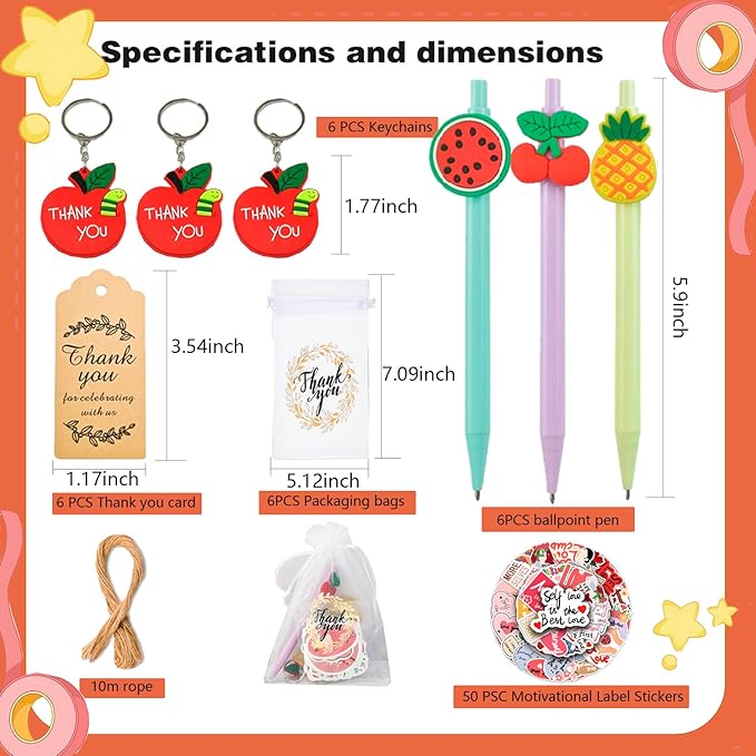 • 1.Sufficient Quantity: you will receive 74 pcs contains 6 motivational teacher pens, 6 teacher keychains, 6 thank you cards, 50 motivational stickers, 6 cable ties and 6 mesh drawstring bags, Sufficient quantity and various styles, enough to meet your needs of sharing with others