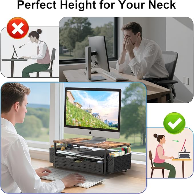 • Ergonomic design: Raise the monitor to eye level for the most comfortable viewing experience, relieve your neck, back, waist, help you develop a good posture and provide a neat workspace.experience.