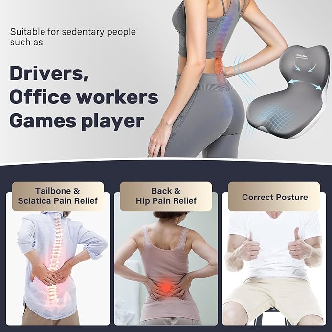 Coverado Seat Cushion and Lumbar Support Pillow One Piece for Car Office Chair, Ergonomic Memory Foam Desk Chair Cushion Back Support Pillow, Sciatica & Back & Tailbone Pain Relief Cushion-Gray